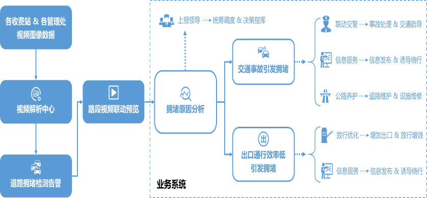 顺利获得对高速公路沿线的视频数据进行AI解析,实现道路拥堵检测预警,并联动调取前后视频监控数据,查看交通拥堵长度和拥堵程度,并将拥堵告警信息推送至业务系统,业务系统向领导推送拥堵预警信息,并顺利获得信息发布给予便民化服务,经公众号或前端信息发布屏发布道路拥堵信息和位置,提醒出行人员注意绕行或减速,顺利获得大数据碰撞,根据拥堵原因触发不同拥堵处置预案: