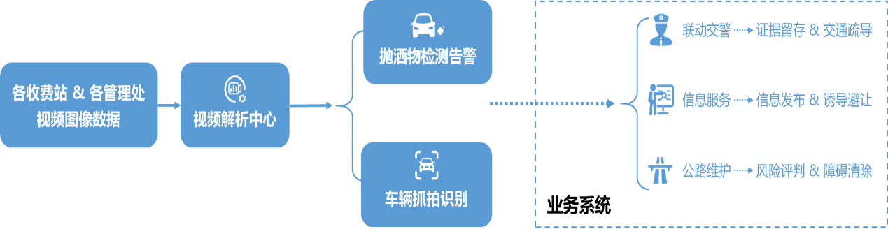 视频解析中心会对各路段视频图像数据进行实时AI分析,一旦检测出有车辆抛洒物的情况发生,将触发车辆抛洒物检测告警,同时提取视频中的车辆车牌、车型等信息,并将告警信息和车辆信息一同推送至业务系统。业务系统接收到信息后,将相关违法证据图片和信息推送到交警部门,实现违法非现场执法;同时将抛洒物事件信息发布出去,提醒各通行车辆注意避让;并基于指挥调度和地图作战系统,调度公路维护人员及时前往现场进行处置和清障。